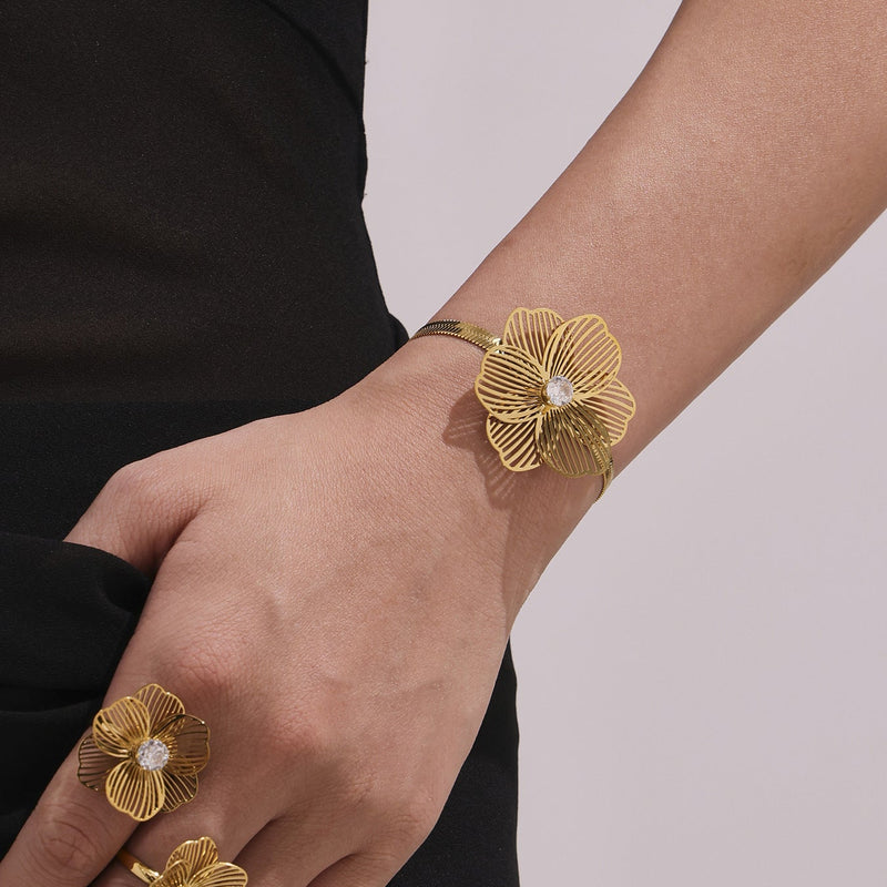 Bratara cu floare 3D din otel inoxidabil placata cu aur 18K