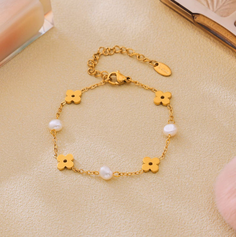 Bratara din otel inoxidabil placat cu aur 18K cu flori si perle de cultura